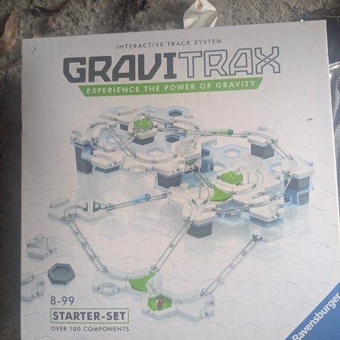 Gravitrax Starter-Set kuglebane byggesæt. Sættet består af et interaktivt banesystem med sekskantede byggeelementer, skinner og stålkugler, som kan kombineres på forskellige måder til at konstruere kuglebaner. Delene er primært i hvid, grå og grøn plast. Egnet som konstruktions- og eksperimentlegetøj, hvor man kan arbejde med tyngdekraft, hastighed og baneforløb. Kan bruges alene som startsæt eller sammen med andre Gravitrax-sæt for udvidede baner.