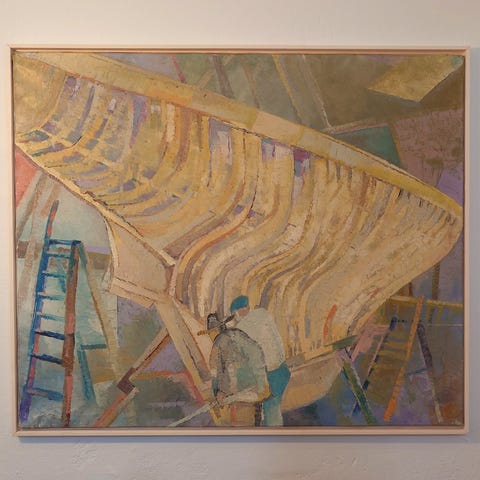 Chr. Blache marinemaleri fra Aarhus. Olie på lærred med motiv af sejlskibe på roligt vand. Billedet viser et større sejlskib omgivet af mindre både under en lys himmel med skyer. Maleriet er signeret i nederste hjørne og dateret Aarhus 1916. Det er indrammet i en profileret guldfarvet ramme med perlekant,der er noget medtaget.