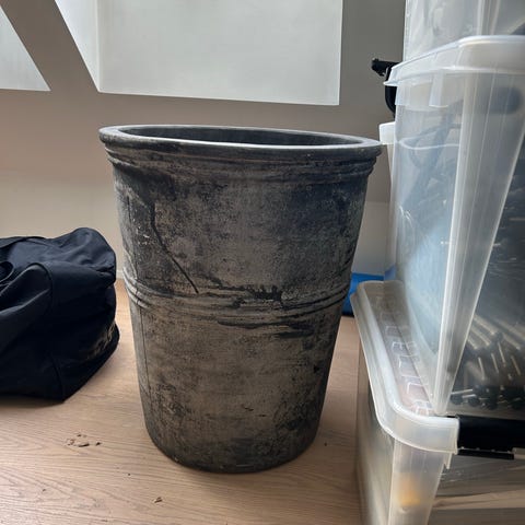 Den har fostret og været hjem for den enorme monstera som ses på billedet. Let at give vand til flere uger, så man trygt kan tage på ferie. Men grundet en mindre lejlighed, sælger vi nu krukken.