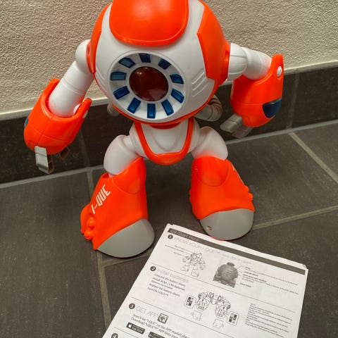 Robotlegetøj hund med fjernbetjening i hvid og blå plast. Hunden er udformet som en elektronisk legetøjshund med bevægelige ben og hoved samt mørk visir-lignende skærm over øjnene. Medfølgende fjernbetjening har flere knapper til styring af funktioner som bevægelse og lyd. Egnet som interaktivt legetøj til børn, der ønsker en elektronisk kæledyrslignende figur, der kan styres på afstand.