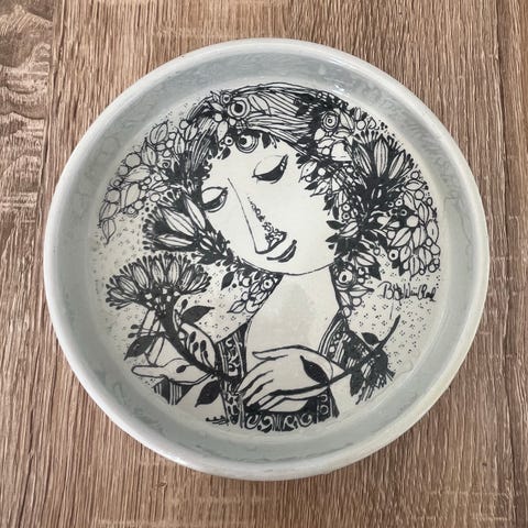 En lille skål fra Nymølle, Denmark med Bjørn Wiinblad, Vinter motiv. Skålen har et skår i bunden. Diameter 10,8cm, Højde 2,8cm