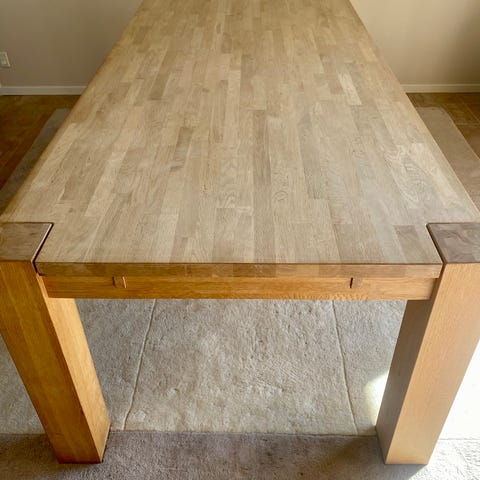 Spisebord i egetræ med 2 udtræksplader á 45 cm så bordet kan blive 290 cm