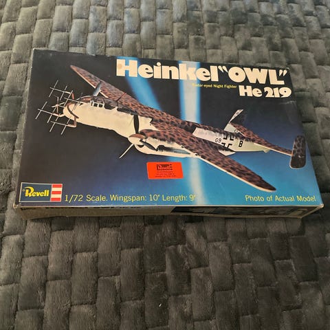 Byggesættet som er nyt og i original æske, indeholder 79 dele, Den færdige model er 163 mm lang og har et vingefang på 206 mm.
