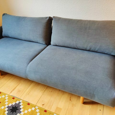 Briks/sovesofa i gråt uld. Kan trækkes ud til dobbelt sovemadras.