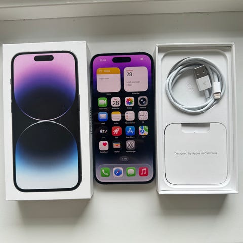 Iphone 14 Pro i hvid med 128gb i super god stand og batteriet er på 100% der den lige lige er blivet skiftet inkl æske ig oplader kabel.