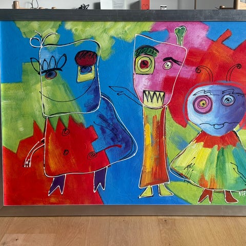 Abstrakt maleri i kvadratisk format med blå, grønne og orange nuancer. Maleriet er monteret i en bred, sølvfarvet ramme. Motivet består af frie, ekspressive penselstrøg og geometriske elementer. Signatur med initialer nederst i højre hjørne. Velegnet til ophæng i stue, kontor eller andre opholdsrum.