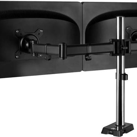 Monitor Mount Pole Office skærmholder til 2 skærme med bordklemme. Passer til skærmstørrelser fra 17 til 32 tommer. Understøtter VESA-standard 75x75 og 100x100. Maksimal belastning er op til 8 kg pr. skærm. Farve: sort. Velegnet til montering af to fladskærme på skrivebord for at frigøre plads og justere skærmenes position i højden og siden.