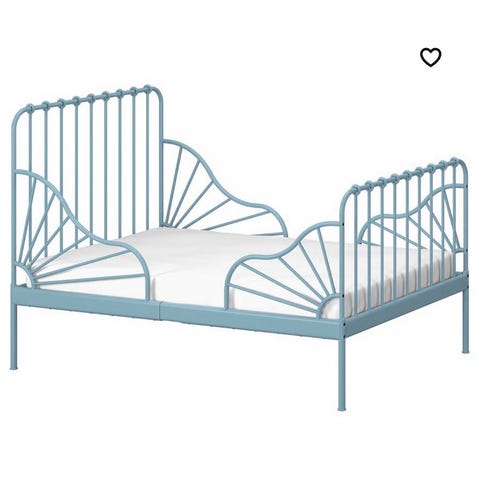 IKEA MINNEN juniorseng i metal med udtræksfunktion. Sengen er vist i en gul farve og har lamelbund. Standardmålene er 80x200 cm, og længden kan justeres, så sengen kan følge barnets højde over tid. D