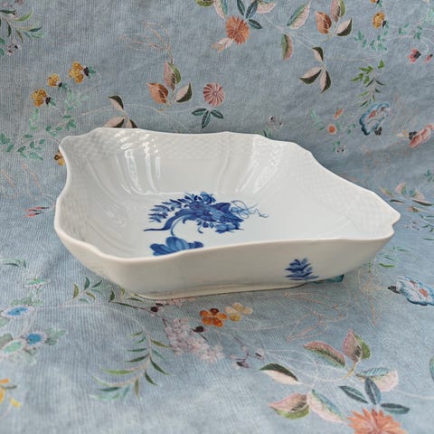 Skål eller kagefad på fod fra Royal Copenhagen i stellet Blå Blomst Svejfet (model nr. 10/1532). Den er i perfekt stand og fremstår fuldstændig som nyt uden skår, revner eller brugsspor. Det er 1. sortering.