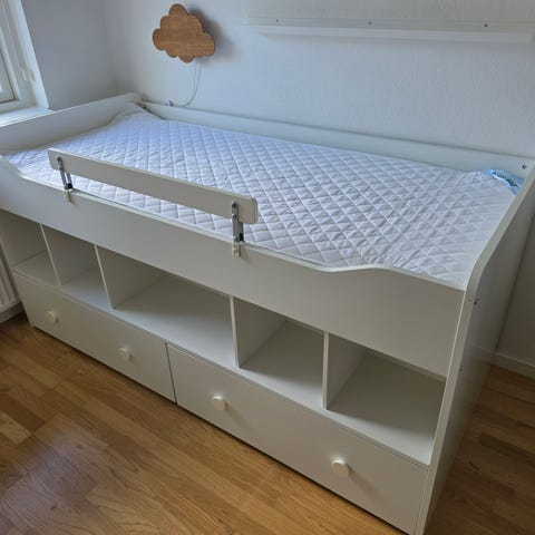 Den er adskilt og madras samt reol medfølger ikke.