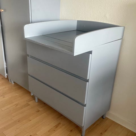 IKEA hack puslekommode lavet af IKEA Hemnes kommode - malet i farven muldvarp og øverste greb udskiftet til greb fra Nordic Nesting.