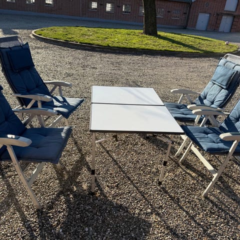 Camp klapbord og klapstol sæt i grå. Sættet består af et lille, kvadratisk klapbord med bærehåndtag og metalstel samt en sammenklappelig stol med gråt stofsæde. Begge dele er lette at folde sammen og transportere og egner sig til brug udendørs, f.eks. i have, på camping eller til picnic.