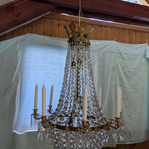 Prismelysekrone fra 1930'erne. Fremstår med få brugsspor og enkelte manglende prismer. Udstyret med stofledninger der nok bør udskiftes inden ibrugtagning.