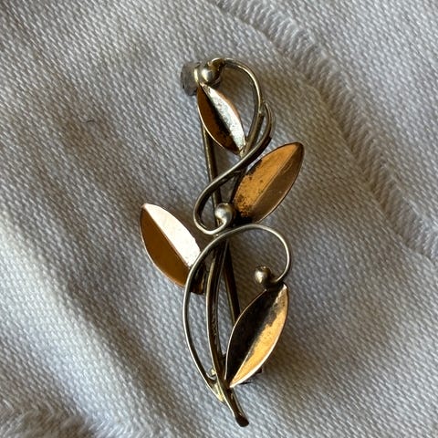 Snö of Sweden broche i sølv til kvinde. Smykket er udformet som et bladmotiv med flere detaljerede blade og nålelukning på bagsiden. Brochen vejer ifølge vægten på billedet ca. 12,29 g. Egnet som dekorativt smykke på jakke, frakke eller bluse.