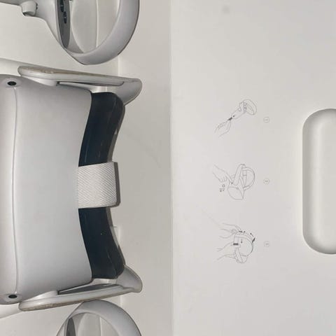 Oculus Quest 2 VR-headset i hvid farve med tilhørende håndcontrollere og hårdt etui. Headsettet har elite straf med ekstra batteritid , hvor den ene strop er forstærket med tape, som ses på billederne. Medfølgende to trådløse controllere i hvid med sorte betjeningsknapper. Etuiet er formstøbt og beregnet til opbevaring og transport af headsettet. Velegnet til VR-spil og -oplevelser, hvor brugeren har brug for et selvstændigt VR-headset med håndcontrollere. Mange ekstra ting medfølger som kan ses på sidste billede