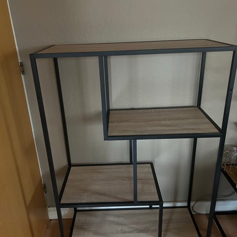 Reol i kombination af sort metalstel og hylder i lyst trælook. Åben konstruktion med flere forskudte hylder, der giver plads til opbevaring og dekoration. Egnet til brug i stue, entré eller kontor til bøger, pynt eller andre genstande. Står frit op ad væg og har rektangulær form med lige linjer og moderne udtryk.