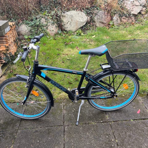Børnecykel 24" i turkis farve. Cyklen har lav indstigning, kædeskærm og bagagebærer. Foran er der monteret en metalcykelkurv med træbund. Sadel og håndtag er i lys farve. Velegnet som hverdagscykel til barn med hjulstørrelse 24".