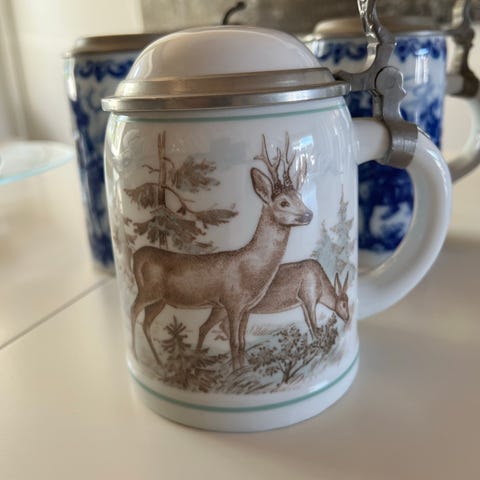 9 retro ølkrus. Kan også bruges som lysestager. Ca 1/2 l