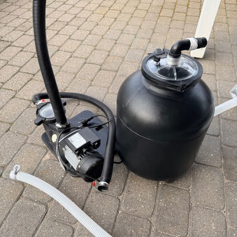Bestway filterpumpe til pool i grå plast. Pumpen drives med 220-240V strøm og er egnet til filtrering af poolvand. Sættet omfatter pumpehus, strømledning, slanger og tilhørende koblings- og dysedele til montering på pool. Velegnet som filtreringsenhed til fritstående havepools, hvor der er behov for cirkulation og rensning af vandet.