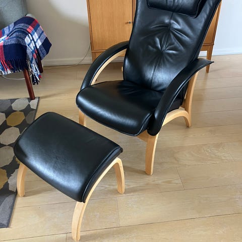 Stolen er som ny, var et fejlkøb og passer ikke ind i vort nye og mindre hjem. Stolen er med beige læder og i bøgetræ. Skamlen følger med. Nu skal den videre, da den fylder op i stuen. Derfor den lave pris. I butikkerne er prisen ca 17.000- 20.000kr.