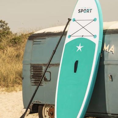 Pathfinder oppustelig paddleboard i blå farve. Sættet på billedet indeholder blandt andet pumpe og tilbehør pakket i taske. Velegnet til brug på vand til rekreativ paddling.