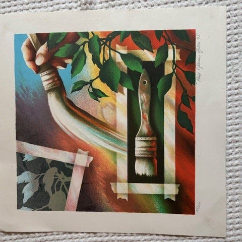 Kunsttryk "Tidslinier" billede i flerfarvet, abstrakt motiv. Trykket er nummereret og signeret i bunden. Det er indrammet med lys passepartout og enkel metalramme med ophæng på bagsiden, klar til at hænge op på væggen. Velegnet som vægdekoration i stue, kontor eller andre opholdsrum.