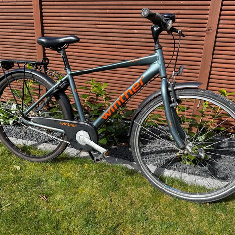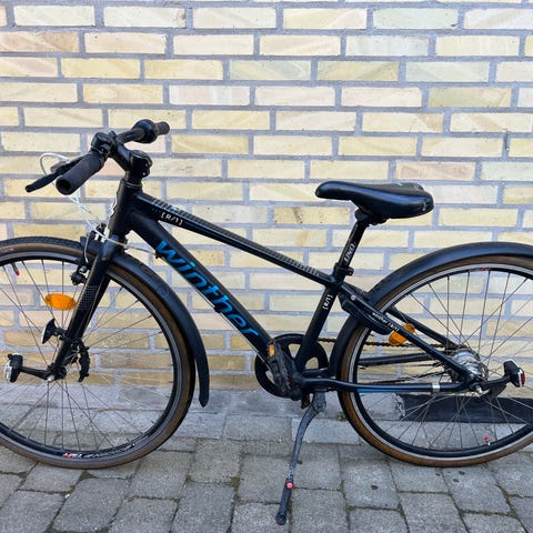 Blå Winther børnecykel, model R1. Hjulstørrelsen er 26” og stellet 16” (40 cm). Cyklen har bagagebærer, skærme over hjulene, lås (med to nøgler), for- og baglygte (som virker), fodbremse, håndbremse, støttefod m.m. Saddelen kan justeres i højden, så cyklen kan tilpasses barnet. Velegnet som hverdagscykel til børn der har højden ca. 140-165 cm (8-14 år).