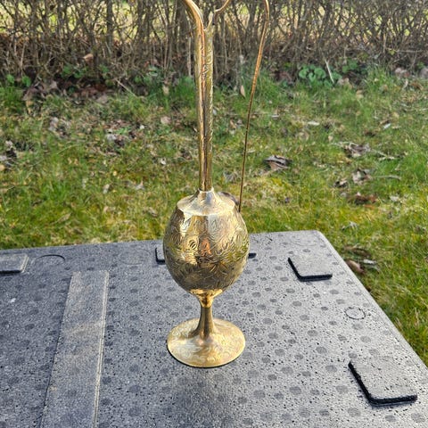 Messing kande med lang tud og buet hank. Kanden er ca. 28 cm høj og har indgraveret mønster på korpus. Egnet som dekoration eller til brug som traditionel hældekande, f.eks. til vand eller andre væsker.