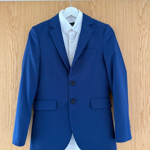 Flot og stilet Nifty for tweens jakkesæt til dreng i str. 14/16år. Sættet består af en blå blazer og matchende bukser, som har elastik i taljen, og en hvid skjorte. Blazeren har klassisk revers, brystlomme og indvendigt foer med Nifty-logo. Skjorten er hvid med knapper med mørk detalje og label “Nifty for Tweens”. Sættet er egnet til konfirmation, fest og andre lejligheder, hvor der ønskes et formelt outfit.