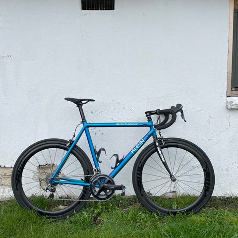 italienske Kuota. Den er bygget som en klassisk racercykel med fokus på let vægt, stivhed og god aerodynamik (tydeligt synligt på den aggressive geometri og de slanke carbon-rør).
