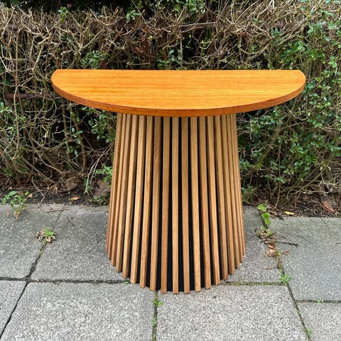 Brugt, men pænt og funktionelt. Der er naturlige brugsspor som slid, og lette mærker på bunden indvendig (typisk for ældre møbler), men det er rent og solidt. Jeg har rengjort det grundigt. Kan let friskes op med en gang møbelolie.