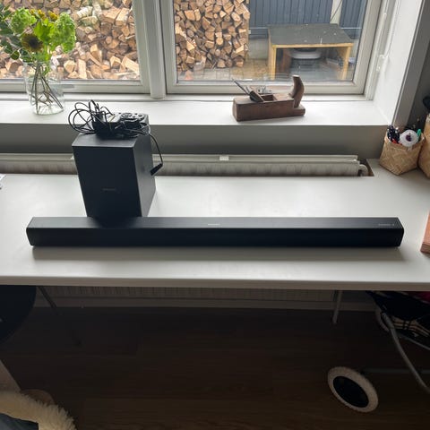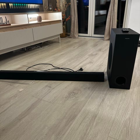 Philips soundbar med trådløs subwoofer og to baghøjttalere i sort.