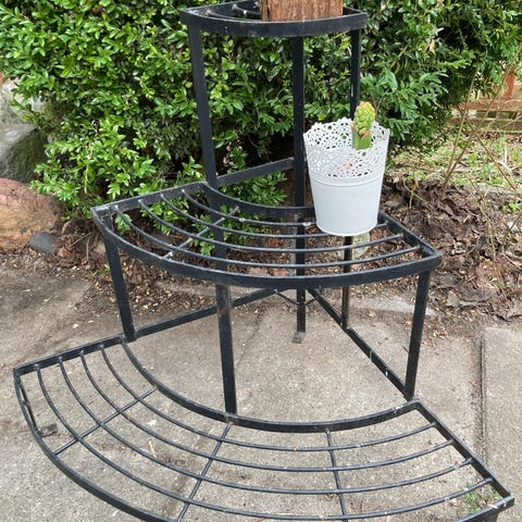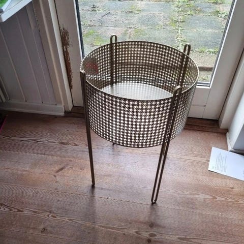 Plantebord med 3 niveauer i hvidlakeret metal. Bordet har tre runde hylder i forskudte højder, velegnet til placering af flere potteplanter. Konstruktionen er åben med rørben og små kanter rundt om hver hylde, som hjælper med at holde potterne på plads. Egnet til indendørs brug som planteopsats i stue, entré eller andre rum, hvor man ønsker at samle planter på et mindre areal.
