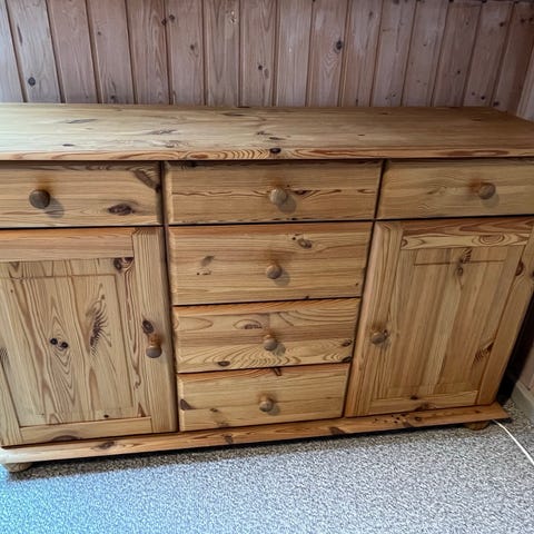 Ældre købmandsdisk / kommode / skænk i fyrretræ, med messinglignende greb. Fra røgfrit hjem. Hentes i Skibbild 7480