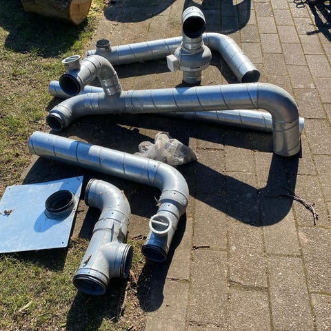 Ventilationsrør og fittings i galvaniseret stål. Sættet omfatter lige rør i forskellige længder samt flere typer samlestykker, bøjninger, muffer, spændebånd og endestykker. Egnede til opbygning eller udvidelse af ventilations- eller udsugningsanlæg i fx bolig, værksted eller garage. Alle dele er i metal og beregnet til rund kanalføring.
