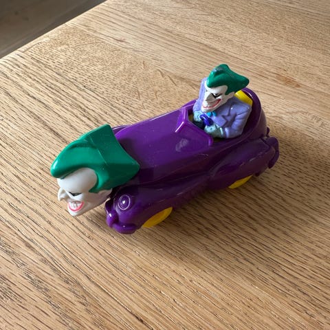 DC Joker legetøjsbil i plastik. Bilen er lilla med gule hjul og har en fast figur af Joker som chauffør samt et Joker-ansigt foran på bilen. Undersiden er mærket med © 1993 DC. Egnet som samlerobjekt eller legetøj for børn, der kan lide superhelteuniverser.