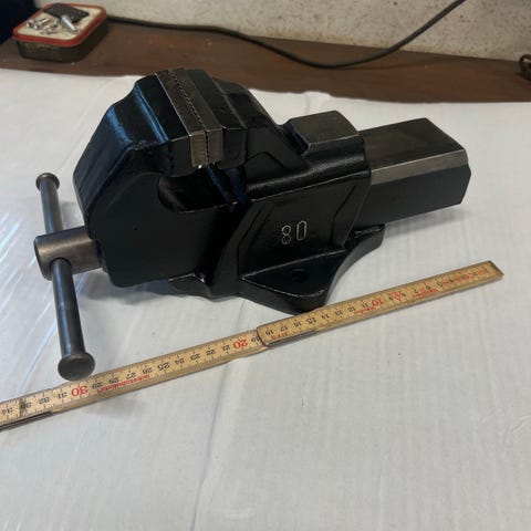 Bekaba skruestik i metal til fastspænding af emner ved bore-, save- eller slibearbejde. Skruestikken har gevindspindel med håndtag til justering af kæbernes åbning. Egnet til montering på arbejdsbord eller maskinbord i værksted eller garage. Mål og kæbeåbning fremgår af billedet med tommestok.