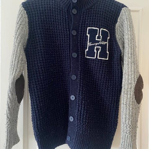 Fragt 40 kr. Dark blue Tommy Hilfiger cardigan for girls, with glitter effect. Really beautiful and in good condition because it hasn't been used much. With buttons on the front and two pockets. Size 152 (11-12 years). Arm length 53 cm, front length 45-46 cm, back length 51 cm. The sweater is maybe a little small in size. Made of cotton, polyester and wool. Thin navy blue girls cardigan, real Tommy Hilfiger.