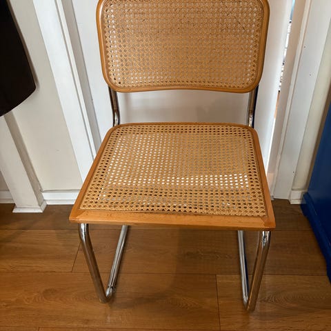 Fin frisvinger stol. Man kan godt sidde i den, men flettet på sæden er gået op i siden, så den trænger til nyt flet.