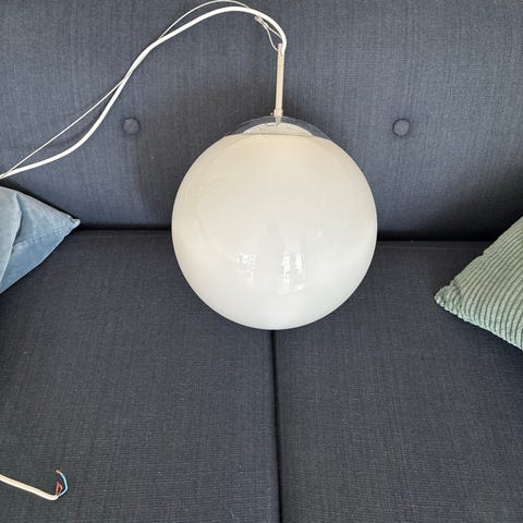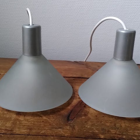 2 ældre loftslamper af frostet glas med hvid ledning på henholdsvis 120 cm og 146 cm. H 15 cm. Begge lamper virker fint og er hele og pæne.