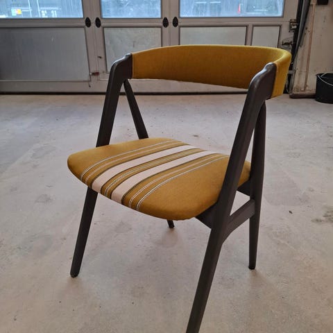 I eg Fra Thomas Harley. Nypolstret - benene er overmalet i sort. Andre mål: Indvendig mål armlæn mod armlæn 45 cm. Fra gulv til underkant sæde 40 cm. En retro stol man sidder godt i. 5 stk. sælges samlet. Kan frit leveres i Københavnsområdet