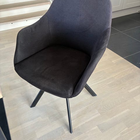 Sinnerup drejestol. Det er en moderne spisebordsstol med en karakteristisk organisk formet skal i sort plast og et stel med fire ben, der har en indbygget drejefunktion