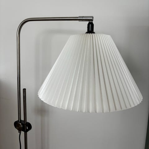 Lamperne er yderst fleksible og fungerer perfekt som læselamper ved sofaen eller lænestolen. Stammen er udført i forkromet stål med en stilren sort fod, og de er monteret med de ikoniske håndfoldede Le Klint-skærme.