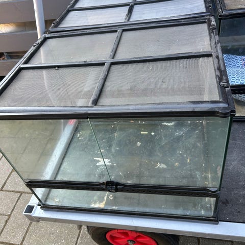 Akvarie med lys i låget måler 51 cm høj 50 cm dyb 49 cm bred. Utæt og skal tætnes hvis det skal bruges til akvarie. Pumpe medfølger. De seneste år har det været brugt til terrarie.