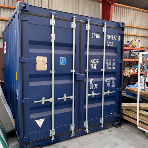 Container ombygget til depotrum med indvendig træbeklædning og hyldesystem. Indvendigt er vægge og loft beklædt med træplader, og der er monteret flere metalreoler med hylder til opbevaring. Fronten er forsynet med indvendig trædørsløsning, mens den oprindelige containerdør med udvendig aflåsningsbeslag stadig er til stede. Rummet er egnet til opbevaring af diverse genstande, materialer eller værktøj, hvor der ønskes et aflukket og overdækket depotrum. Som det kan ses på billederne er der en utæthed i tag men kan blive en lækker opbevaring 👍🏻 bud modtages