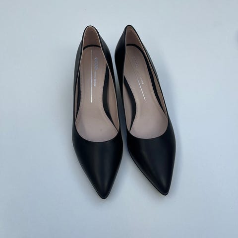 Ecco festsko til dame i str. 38. Klassiske, elegante sorte sko med lukket, spids snude og blokhæl i middel højde. Overdel i glat sort læder og indvendig læderforing. Elegante ved festlige lejligheder eller til hverdag, hvor en enkel og neutral pumps-lignende sko ønskes.