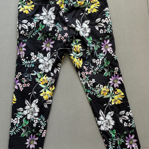 H&M bukser til kvinder i størrelse L/XL Bukserne er fremstillet i polyester og har et multifarvet leopardmønster. De har elastik i taljen med snøre samt lynlåslommer i siderne. Velegnede som hverdagsbukser eller afslappede bukser. De blev brugt 2-3 gange. Kan sendes med Dao for 43kr