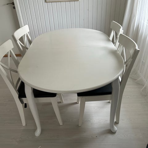 Der medfølger 6 lækre stole sæde og rygstøtte i sort kunstlæder. Træet er Sæbebehandlet, så det fremstår med hvid skær.