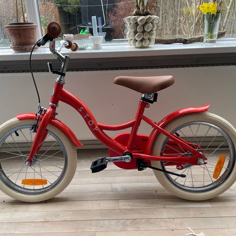 STOY børnecykel 16" i grøn med lyse dæk og brun sadel og håndtag. Cyklen har kædeskærm, støtteben, for- og bagreflekser samt kurv foran på styret. Velegnet som hverdagscykel til børn, der passer til 16" hjulstørrelse. Fejler intet andet end en lille rustplet på styret (se billede
