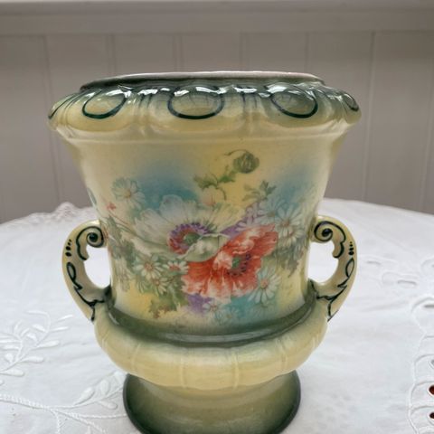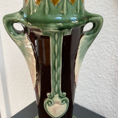 Majolika vase, 120 år gl., Smuk gammel majolika vase . Vasen er smuk buttet og helt fantastisk i farverne.